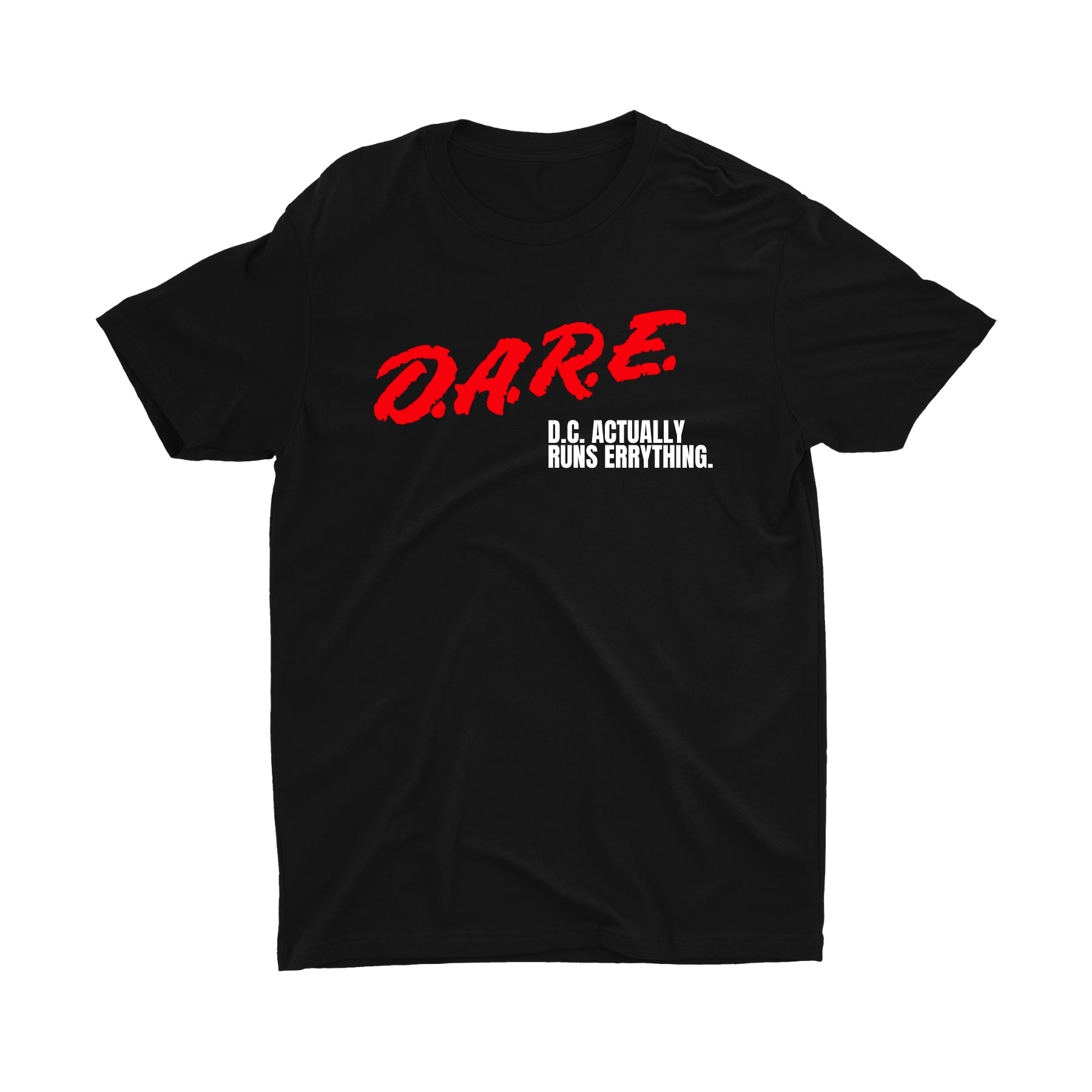 Flip the script on the classic with a bold design that gives D.C. the flowers it deserves. Featuring a sharp red D.A.R.E. across the chest and the statement “D.C. Actually Runs Errythang” stamped underneath, this piece reps the District with attitude and authority.